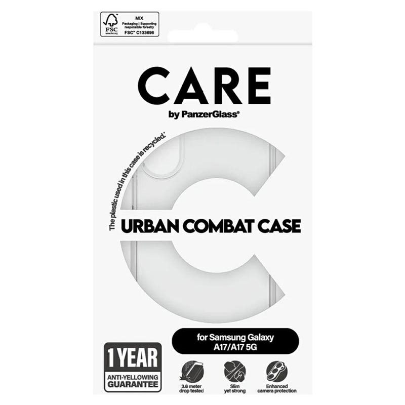A capa CARE by PanzerGlass Flagship para Samsung Galaxy A17, Galaxy M17 Urban Combat com moldura transparente foi concebida para quem precisa de uma proteção robusta sem sacrificar o estilo. Fabricada em plástico 100% reciclado, esta capa foi concebida para suportar quedas até 4,8 metros e oferece uma maior resistência a riscos e choques. É também compatível com o carregamento sem fios e inclui uma garantia anti-amarelamento de 1 ano.