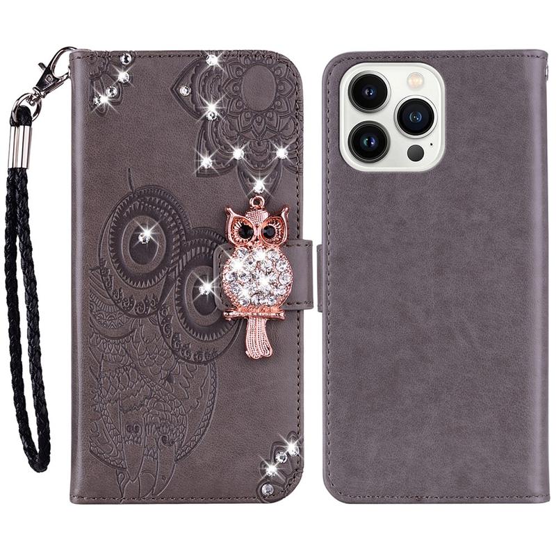 Capa de carteira com strass de coruja para iPhone 15 Pro
