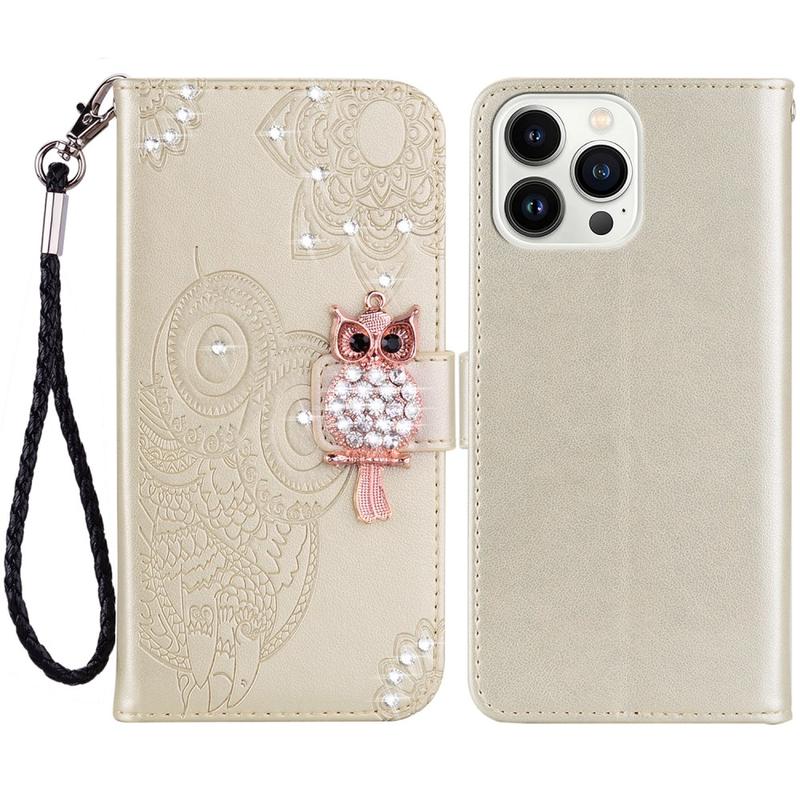 Capa de carteira com strass de coruja para iPhone 15 Pro Max