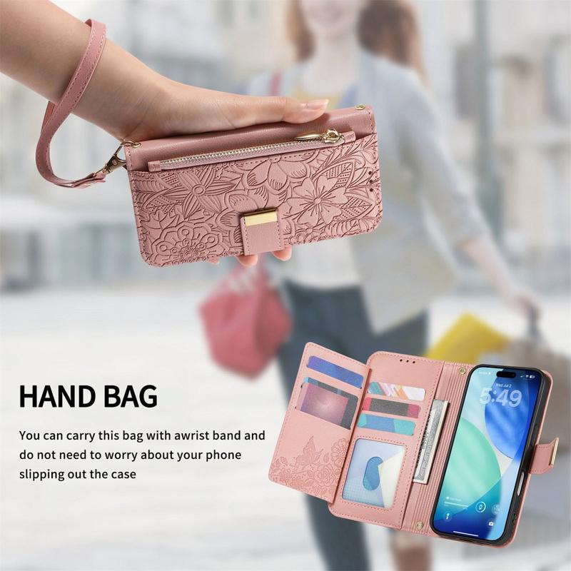 Capa para carteira com padrão floral e de folhas, com bolso com fecho de correr e correia de pulso para iPhone Air