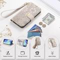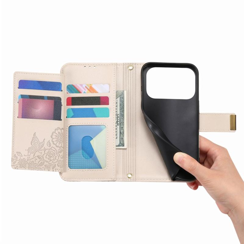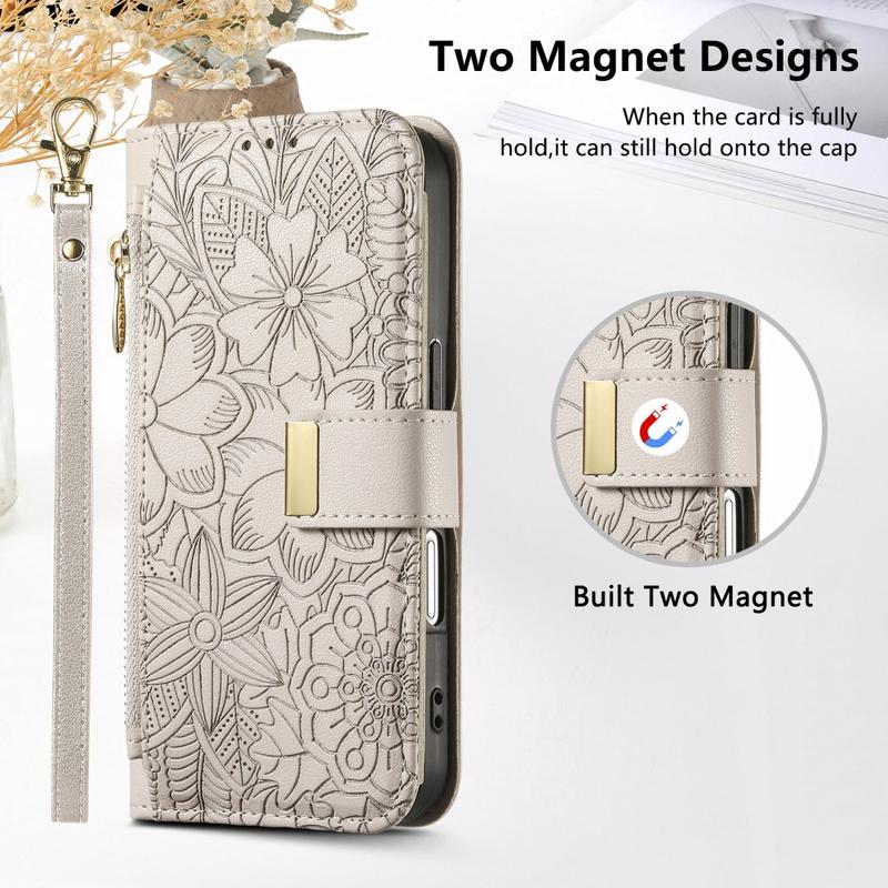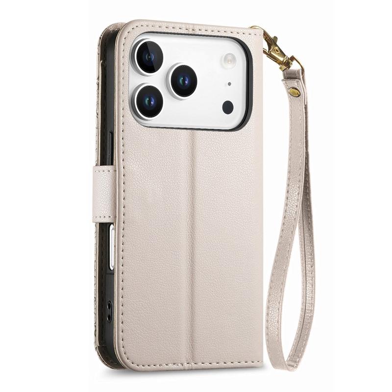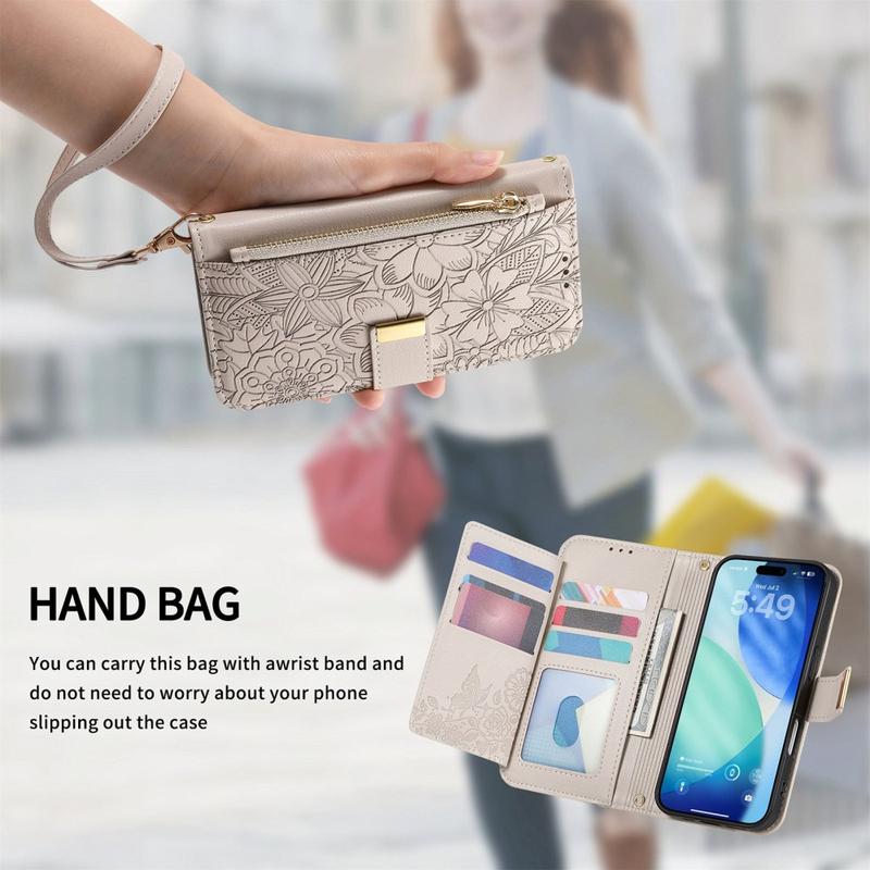 Capa para carteira com padrão floral e de folhas, com bolso com fecho de correr e correia de pulso para iPhone 17 Pro