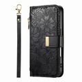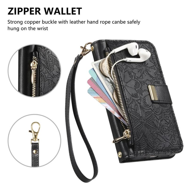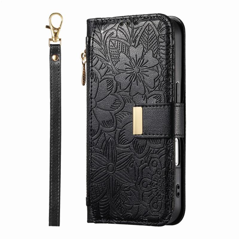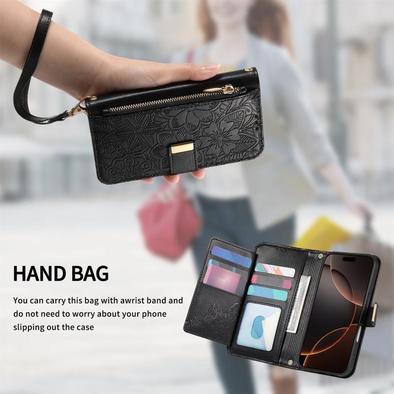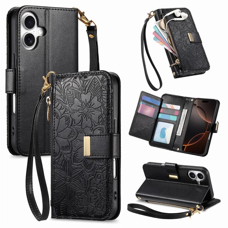 Capa para carteira com padrão floral e de folhas, com bolso com fecho de correr e correia de pulso para iPhone 17