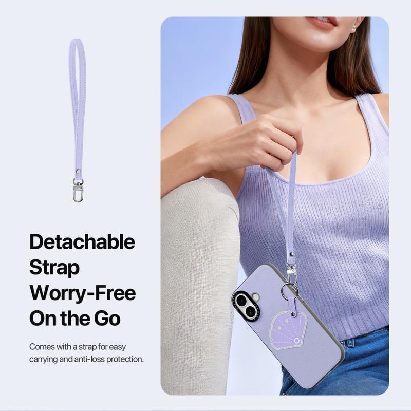 Inclui uma correia amovível para facilitar o transporte durante viagens, deslocações ou actividades diárias. Proporciona uma segurança adicional contra perdas, ao mesmo tempo que dá ao seu iPhone 17 um toque de acessório na moda.