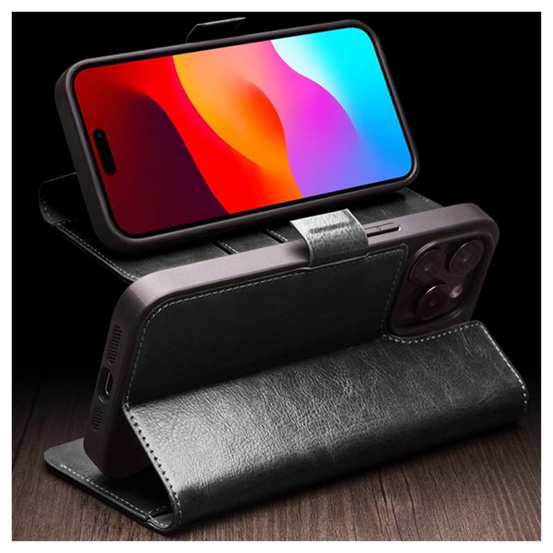 Proteja o seu iPhone 15 Pro Max, de forma elegante e moderna, com esta bolsa tipo carteira clássica, da Qialino. Além disso, mantenha os seus cartões necessários e o seu dinheiro nos compartimentos internos.