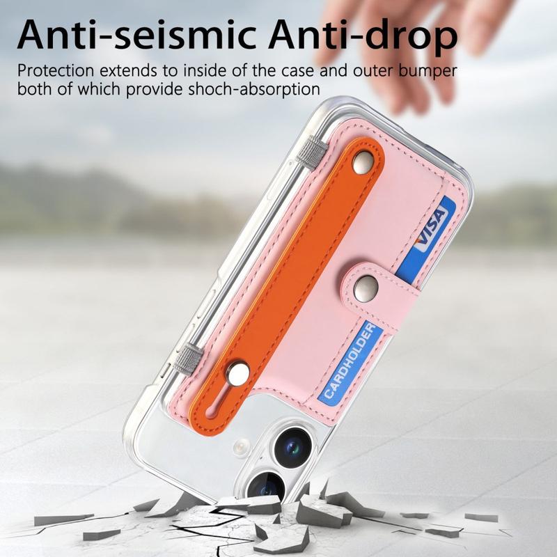 Capa de plástico CY1 para iPhone 16 - Ranhura para cartões, bracelete, suporte para telemóvel - Rosa