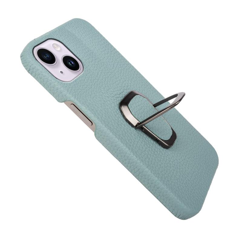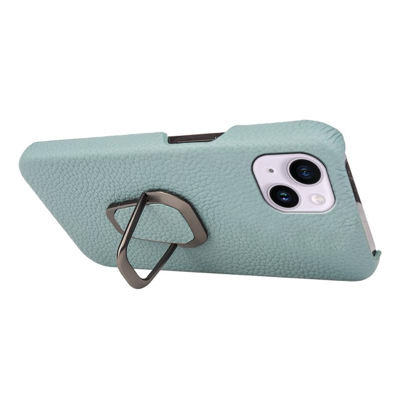 Para iPhone 14 Plus Couro Genuíno Revestida para PC Capa Protetora para Telefone Suporte para Anel Kickstand Design Litchi Textura Antiderrapante Estojo à Prova de Choque