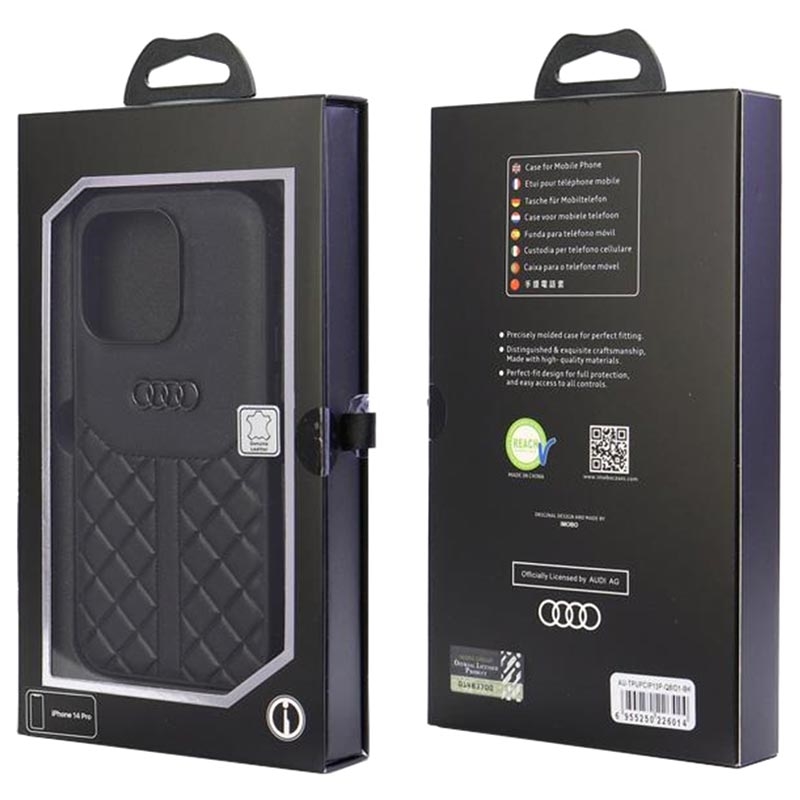A elegância e a qualidade premium da Audi tornam esta capa revestida em couro perfeita para o seu iPhone 13, iPhone 13 Pro. Esta capa elegante é feita de material TPU flexível, revestida com o melhor couro genuíno com padrões geométricos e o logotipo da Audi em relevo. Dessa forma, seu iPhone 13, iPhone 13 Pro ganha um design luxuoso, proteção confiável e aderência segura.