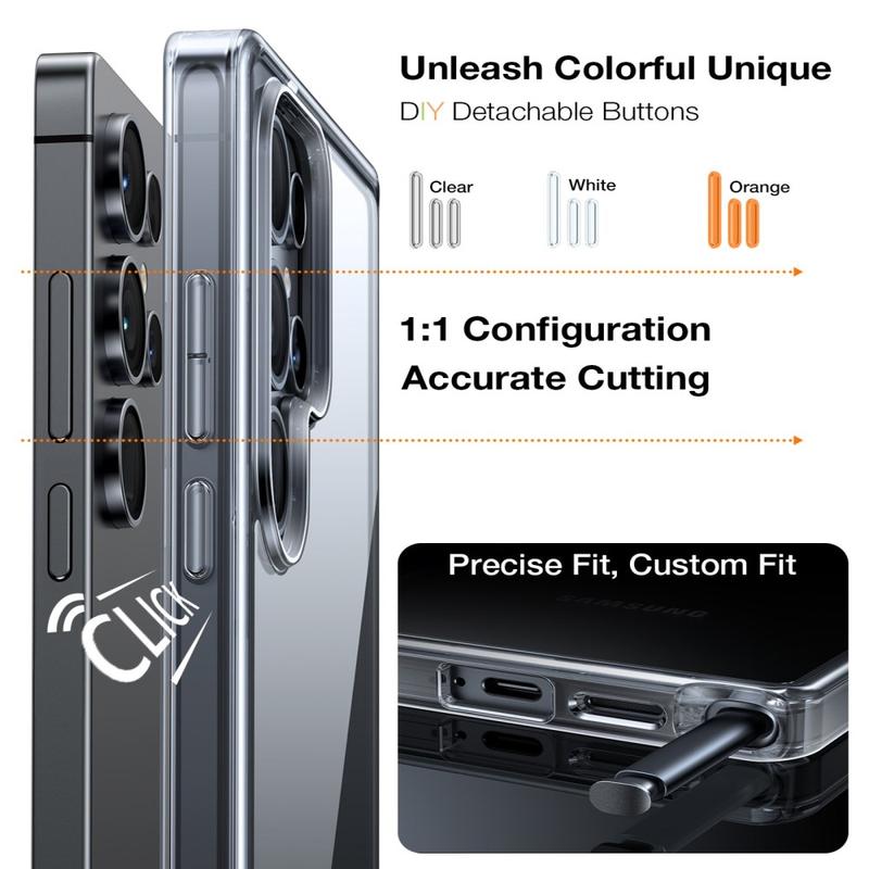 A capa inclui três conjuntos de cores de botões intercambiáveis, permitindo-lhe personalizar o aspeto do seu Samsung Galaxy S26 Ultra. Troque facilmente os botões para combinar com o seu estilo, roupa ou disposição e crie uma aparência única e personalizada.