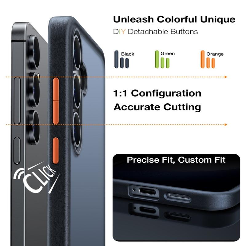 A capa inclui três conjuntos de cores de botões intercambiáveis, permitindo-lhe personalizar o aspeto do seu Samsung Galaxy S26+. Troque facilmente os botões para combinar com o seu estilo, roupa ou disposição e crie uma aparência única e personalizada.