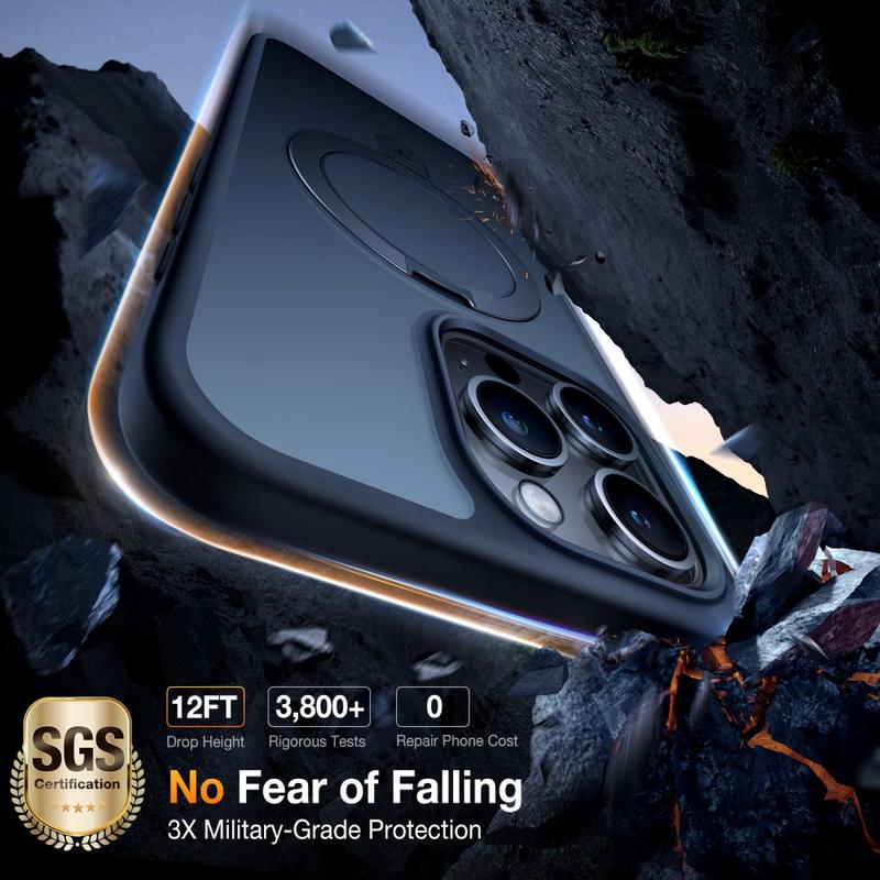 Coloque esta elegante capa no seu iPhone 15 Pro e obtenha três elementos essenciais num só: alinhamento MagSafe sólido como uma rocha, um suporte metálico dobrável para visualização em mãos-livres e proteção contra quedas de nível militar certificada pela SGS - tudo isto sem sacrificar a elegância que cabe no bolso.
