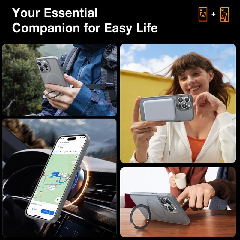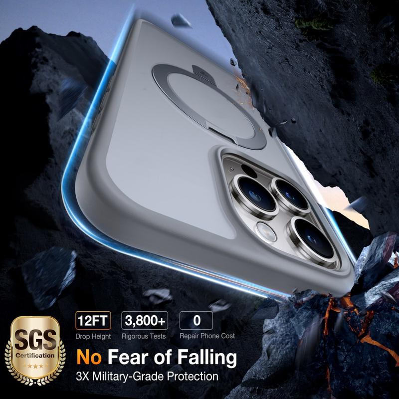Coloque esta elegante capa no seu iPhone 15 Pro Max e obtenha três elementos essenciais num só: alinhamento MagSafe sólido como uma rocha, um suporte metálico dobrável para visualização em mãos-livres e proteção contra quedas de nível militar certificada pela SGS - tudo isto sem sacrificar a elegância que cabe no bolso.