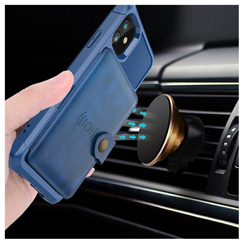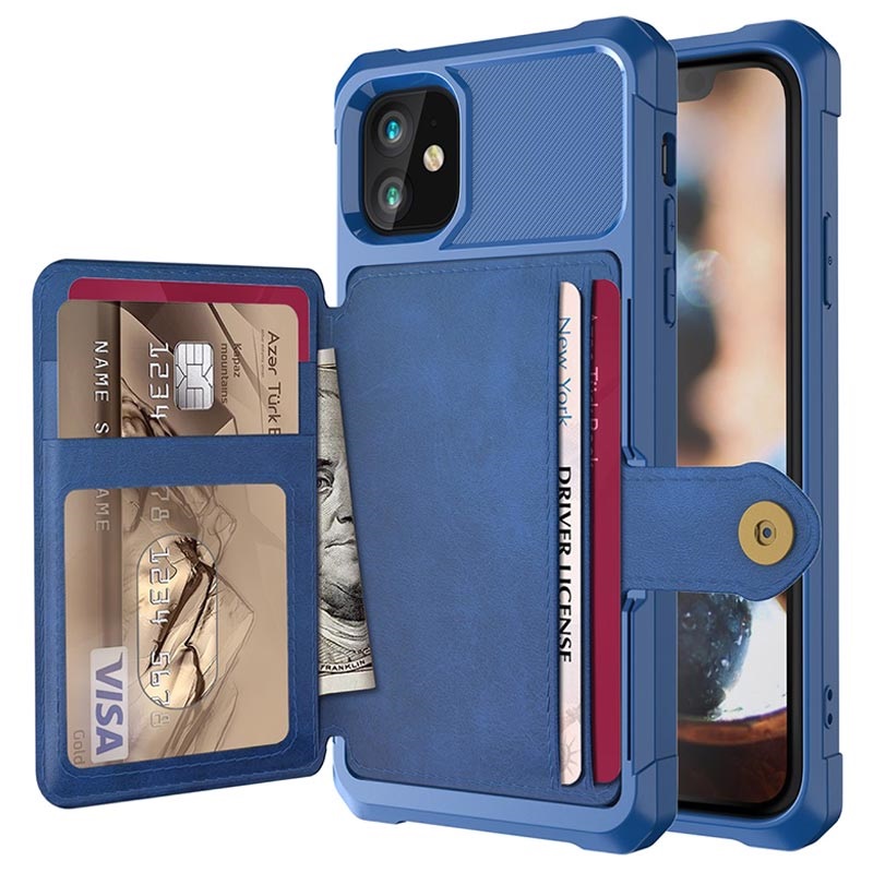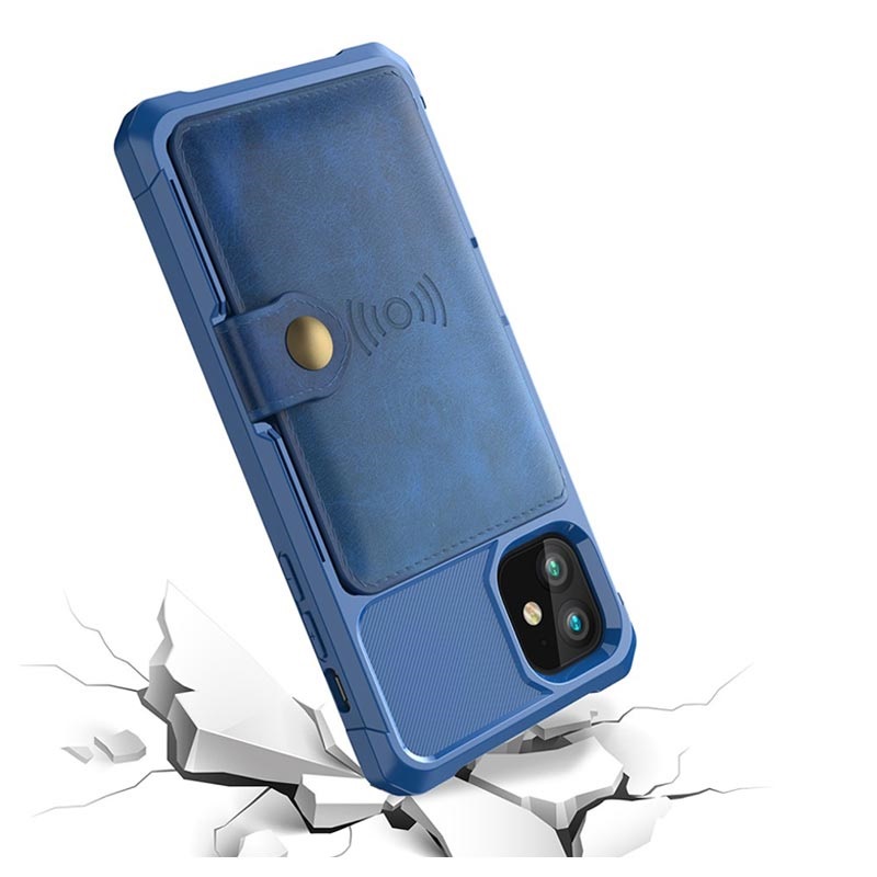 - Bolsa tipo carteira para iPhone 12 Mini com fecho que consiste num seguro botão de pressão, design de carteira e vários compartimentos para cartões e um bolso para dinheiro