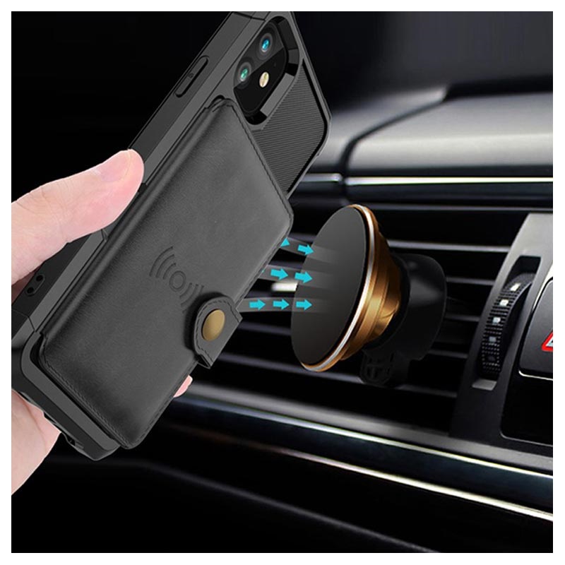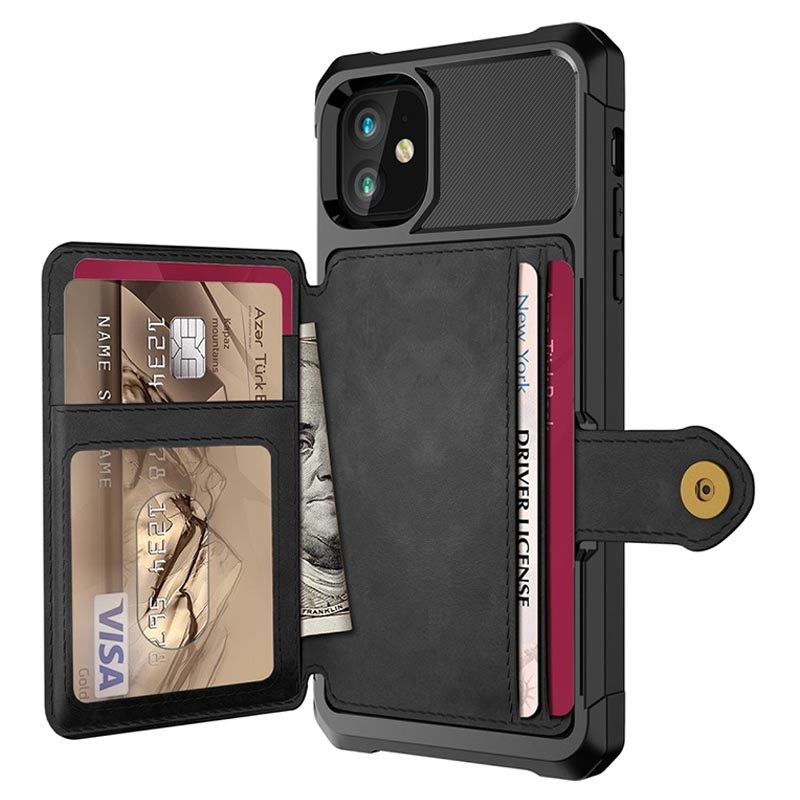- Bolsa tipo carteira para iPhone 12 Mini com fecho que consiste num seguro botão de pressão, design de carteira e vários compartimentos para cartões e um bolso para dinheiro