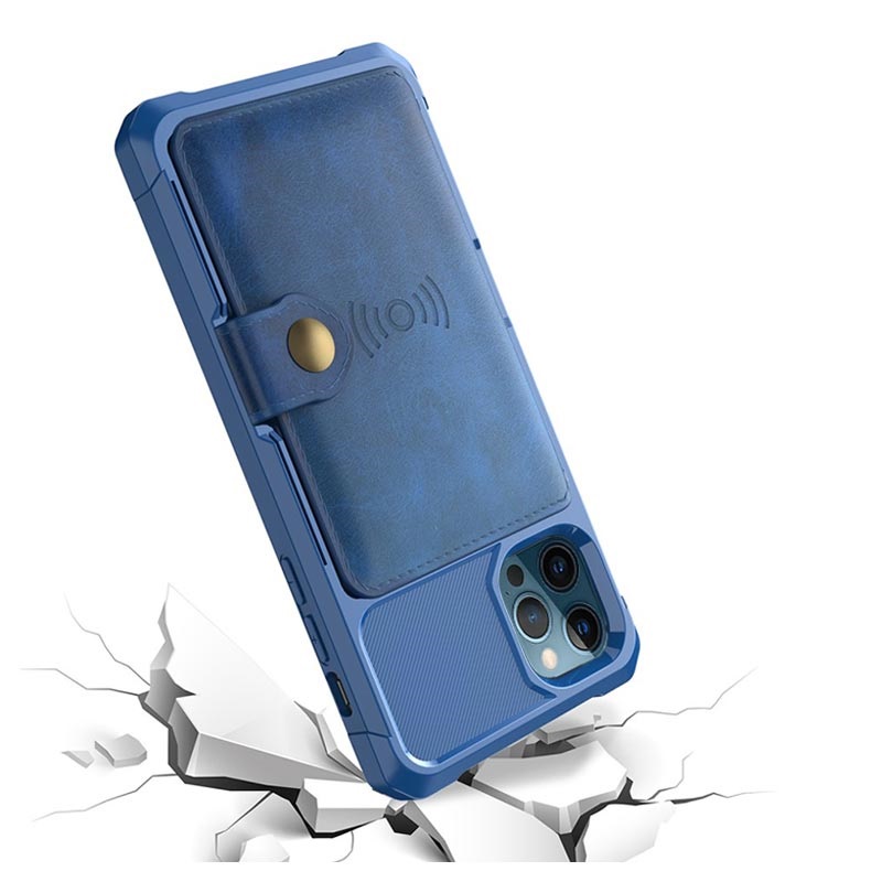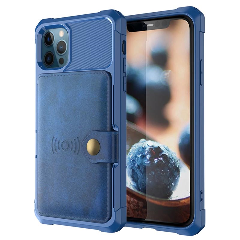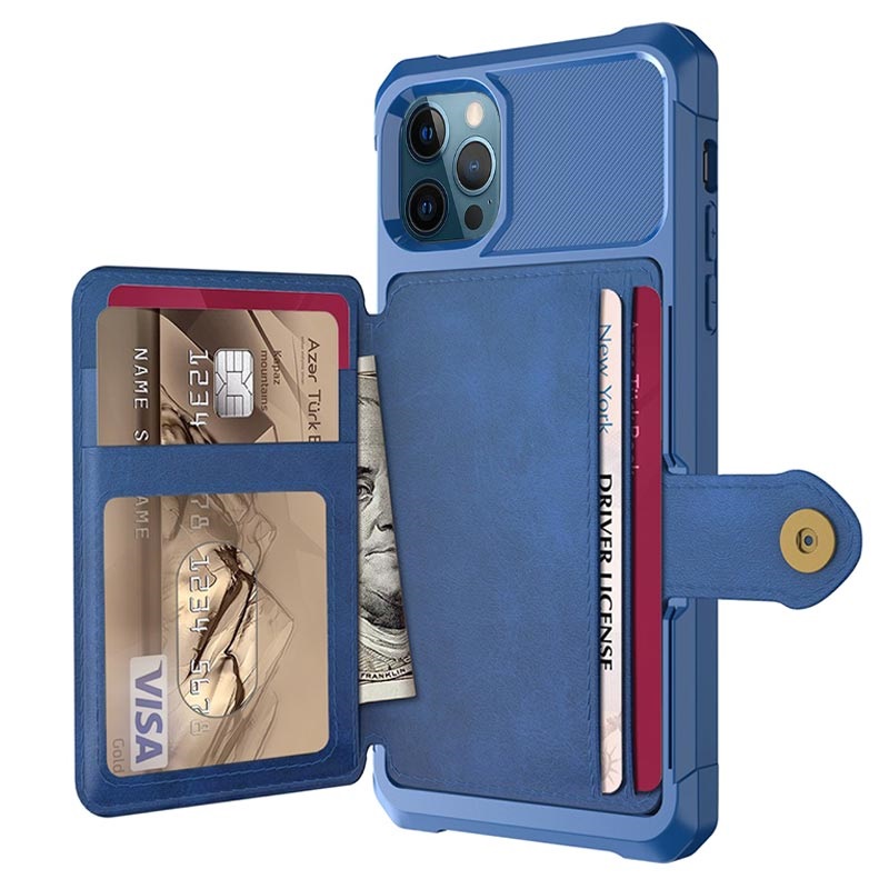 - Bolsa tipo carteira para iPhone 12 Pro Max com fecho que consiste num seguro botão de pressão, design de carteira e vários compartimentos para cartões e um bolso para dinheiro
