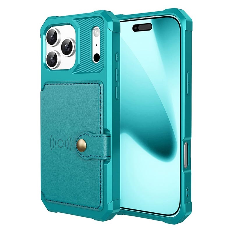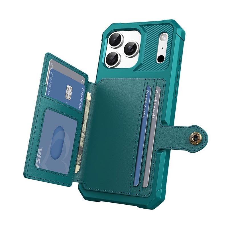 - Bolsa tipo carteira para iPhone 17 Pro Max com fecho que consiste num seguro botão de pressão, design de carteira e vários compartimentos para cartões e um bolso para dinheiro