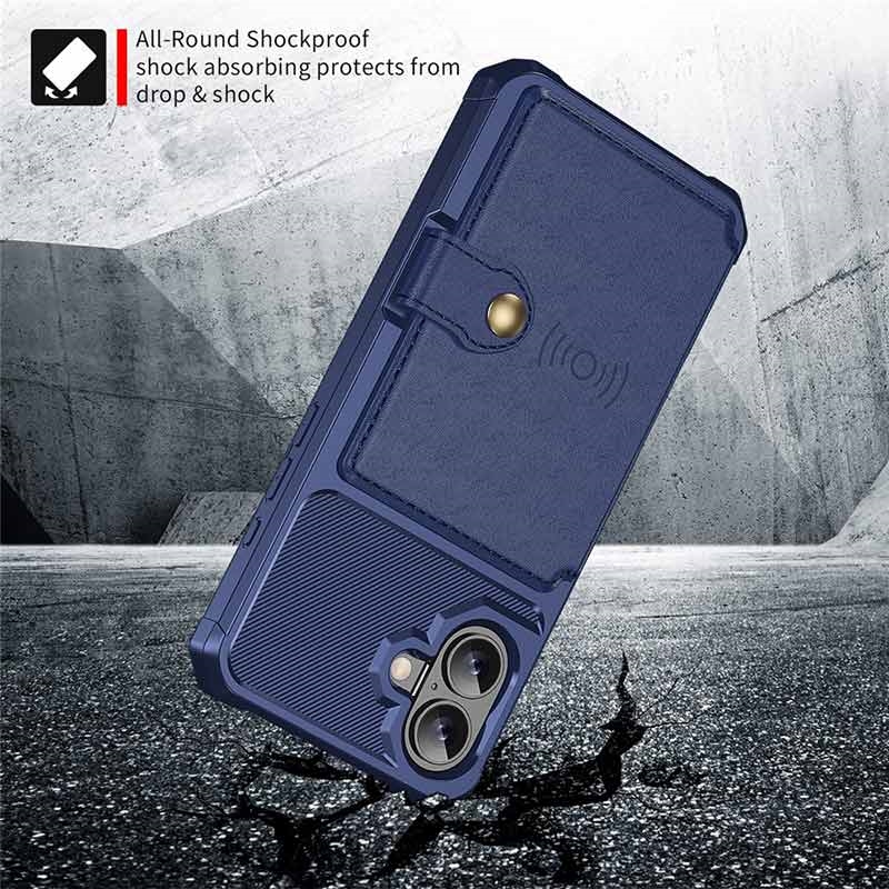 - Bolsa tipo carteira para iPhone 17 com fecho que consiste num seguro botão de pressão, design de carteira e vários compartimentos para cartões e um bolso para dinheiro