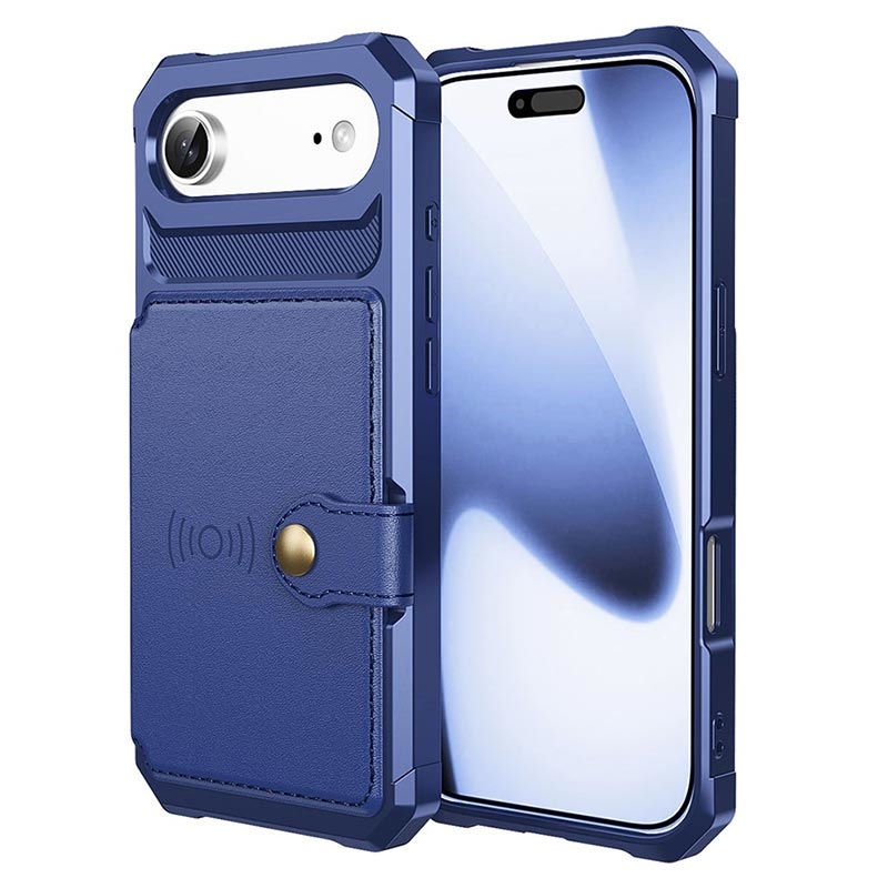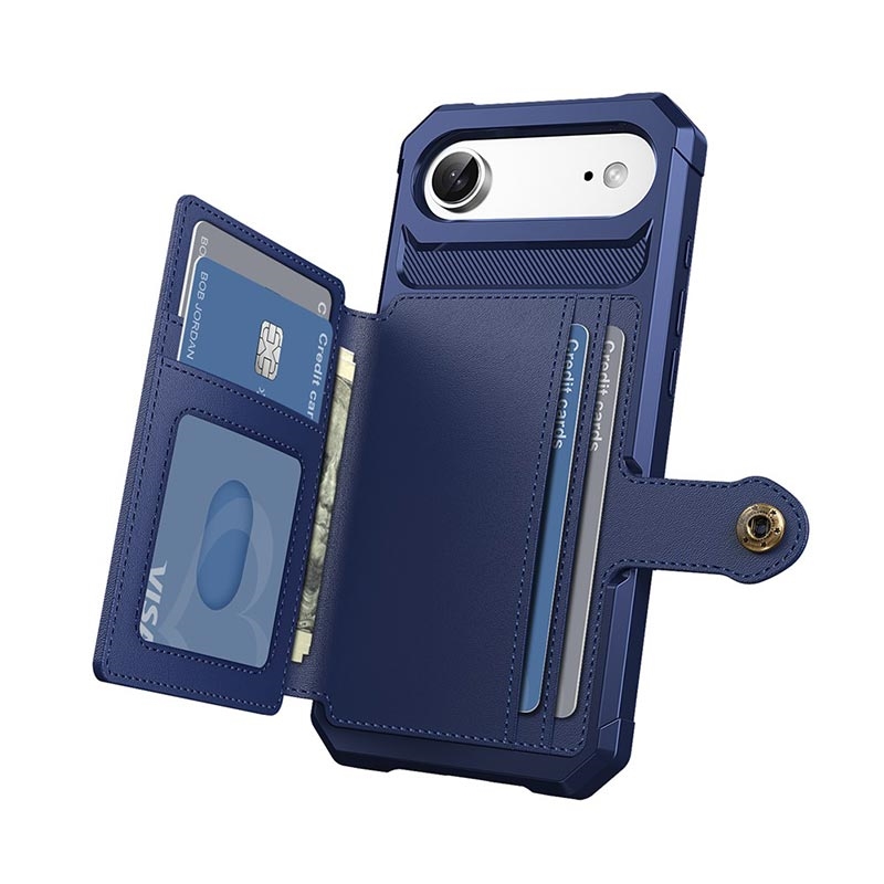 - Bolsa tipo carteira para iPhone Air com fecho que consiste num seguro botão de pressão, design de carteira e vários compartimentos para cartões e um bolso para dinheiro