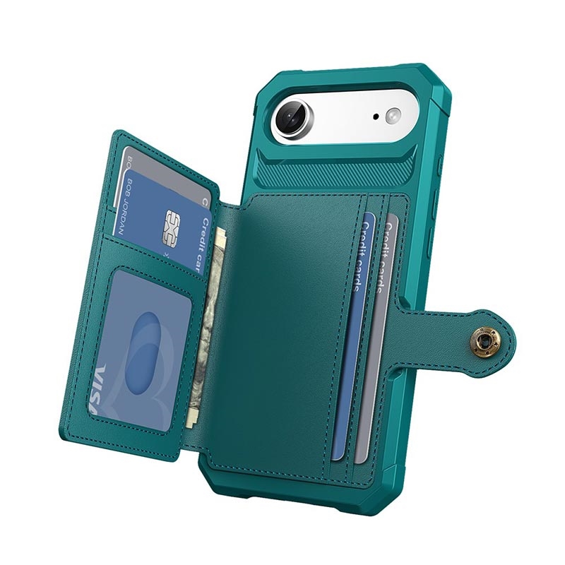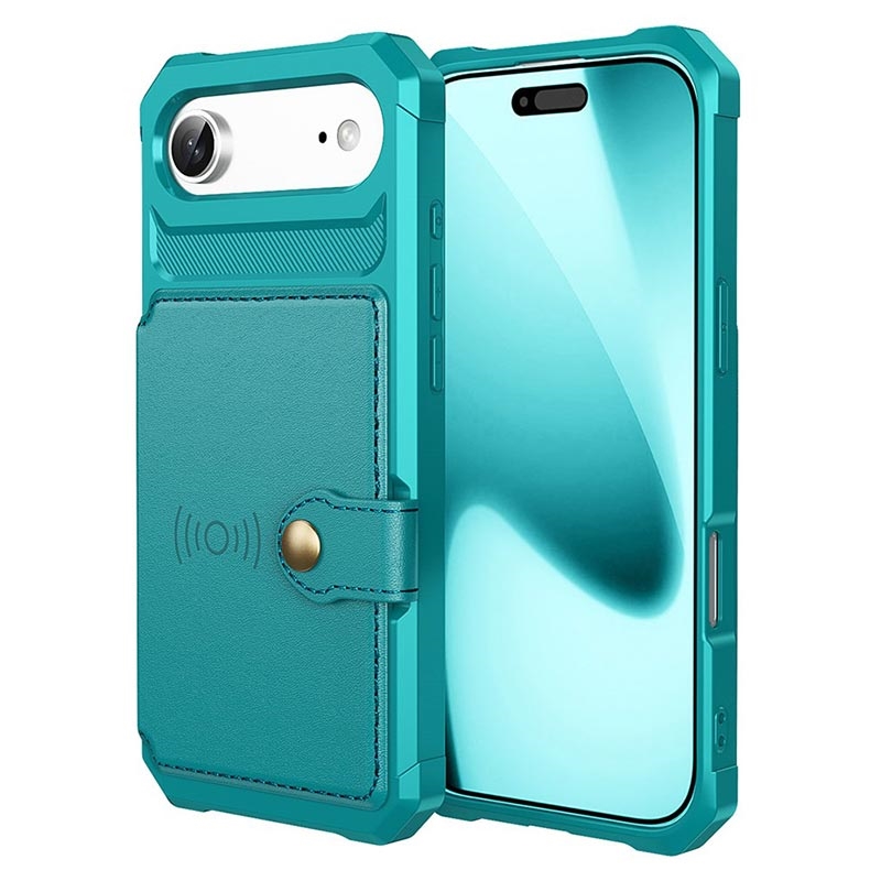 - Bolsa tipo carteira para iPhone Air com fecho que consiste num seguro botão de pressão, design de carteira e vários compartimentos para cartões e um bolso para dinheiro