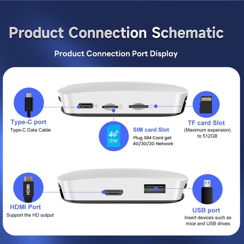 Portas: Indicador LED, porta fêmea Tipo C, suporte para cartão TF, porta fêmea USB, suporte para cartão SIM, interface HDMI