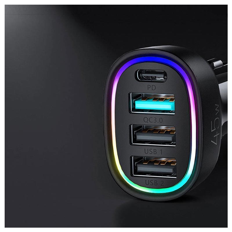 Carregador de Carro Multiportas Joyroom JR-CL09 45W - 1x USB-C PD, 1x QC3.0 USB, 2x USB, LED