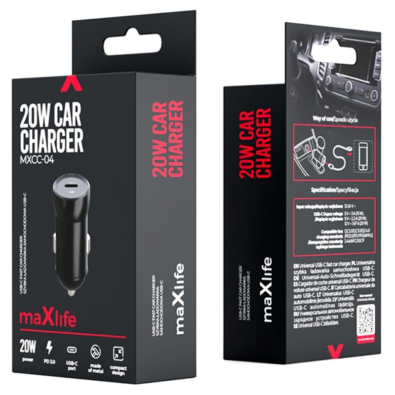 Carregador de Carro Rápido USB-C Maxlife MXCC-04 - 20W, PD3.0, QC3.0, Apple 2.4A, Samsung AFC