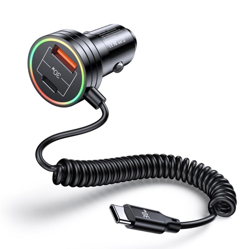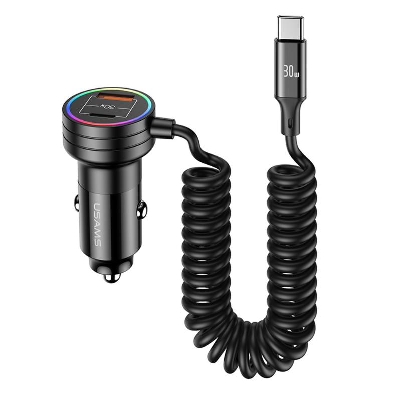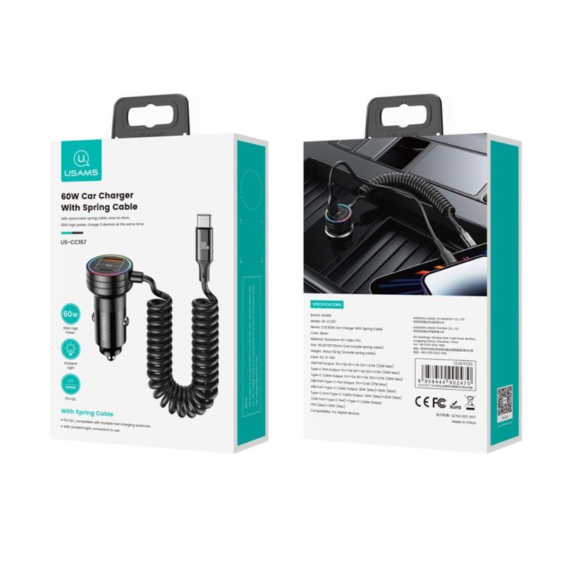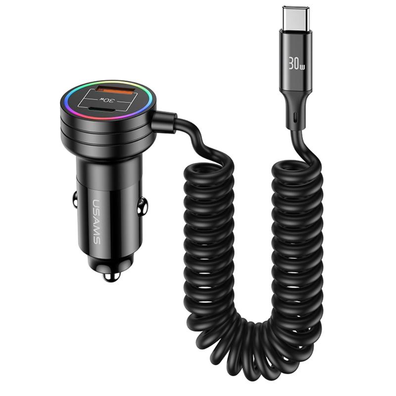 Carregador de automóvel Usams US-CC167 60W com portas USB-C, USB-A e cabo USB-C - Luz ambiente, fornecimento de energia