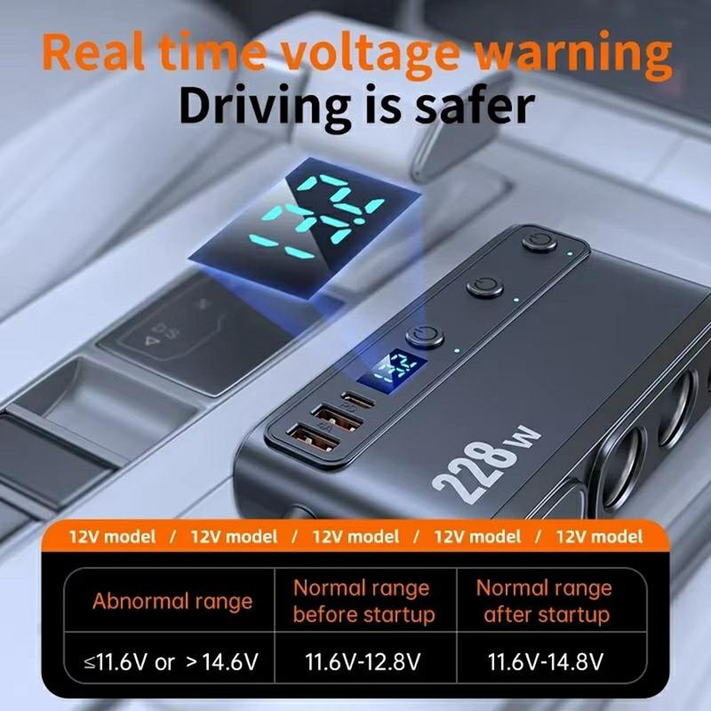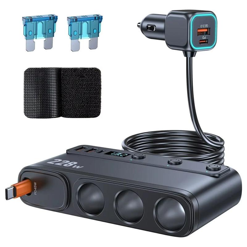 Carregador de automóvel 9 em 1 de 228 W com divisor de isqueiro de carregamento rápido com interruptores independentes e ecrã LED - 3x QC3.0 USB-A, 2x PD USB-C, cabo PD USB-C, 3x tomada de isqueiro