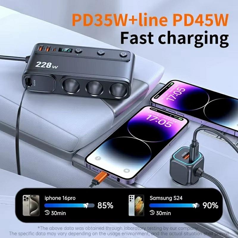 Com uma impressionante potência total de 228 W, este carregador para automóvel 9 em 1 permite-lhe alimentar e carregar até nove dispositivos em simultâneo. Quer esteja a fazer uma longa viagem de carro, a deslocar-se para o trabalho ou a utilizar vários aparelhos para fins profissionais, terá sempre energia fiável na ponta dos dedos.