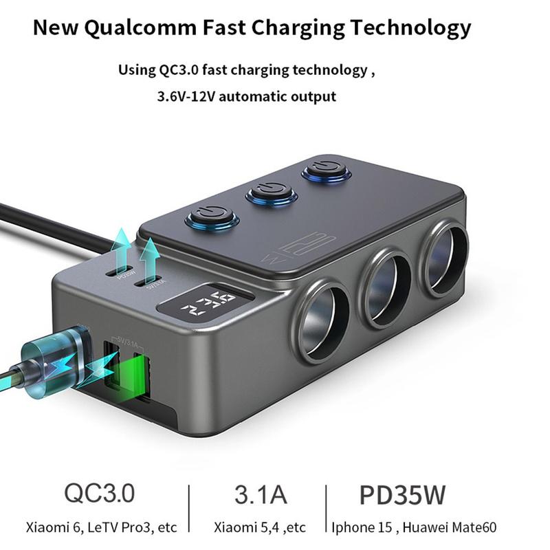 O carregador de carro de carregamento rápido PD 35W se destaca por sua mistura de velocidade, potência e versatilidade. Com cinco portas USB e saída total de 120W, ele lida sem esforço com vários dispositivos ao mesmo tempo - ideal para deslocamentos ocupados ou viagens em grupo. O design 3 em 1 maximiza as tomadas eléctricas limitadas do seu automóvel, enquanto a sua construção duradoura garante segurança e fiabilidade em todas as viagens.