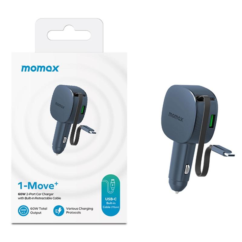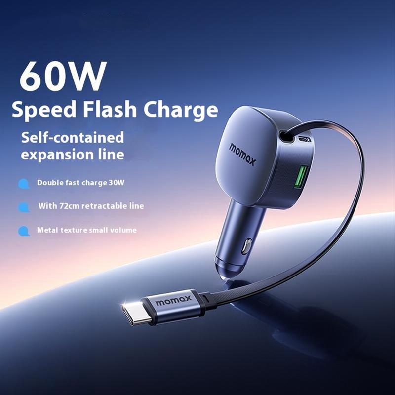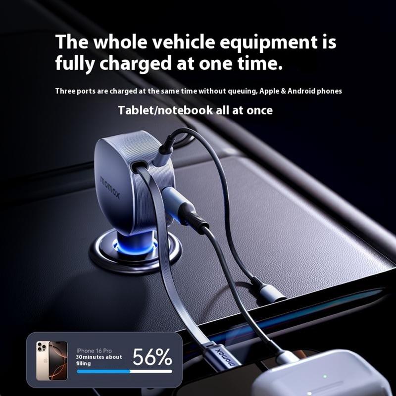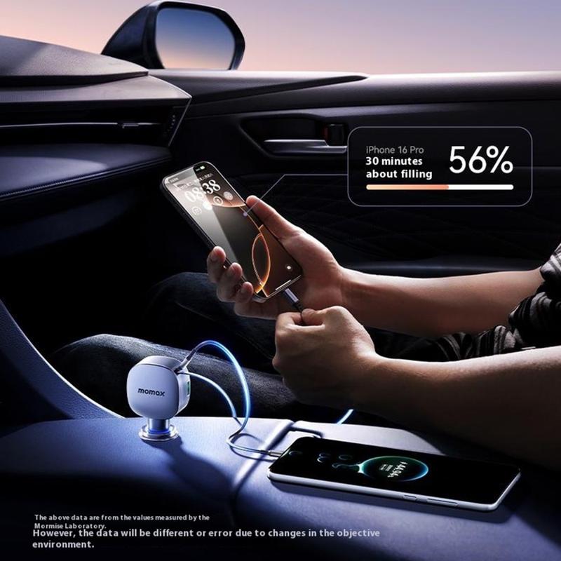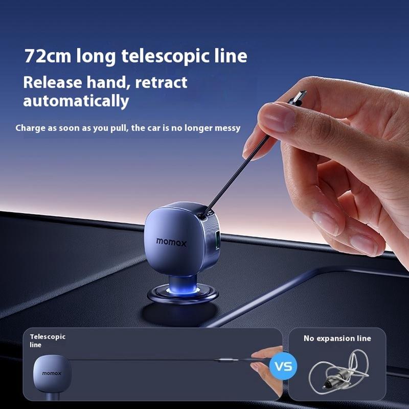 Carregador de automóvel Momax 60W - Cabo USB-C retrátil de 30 W + Porta USB-C de 30 W + Adaptador de carregamento rápido USB-A de 24 W