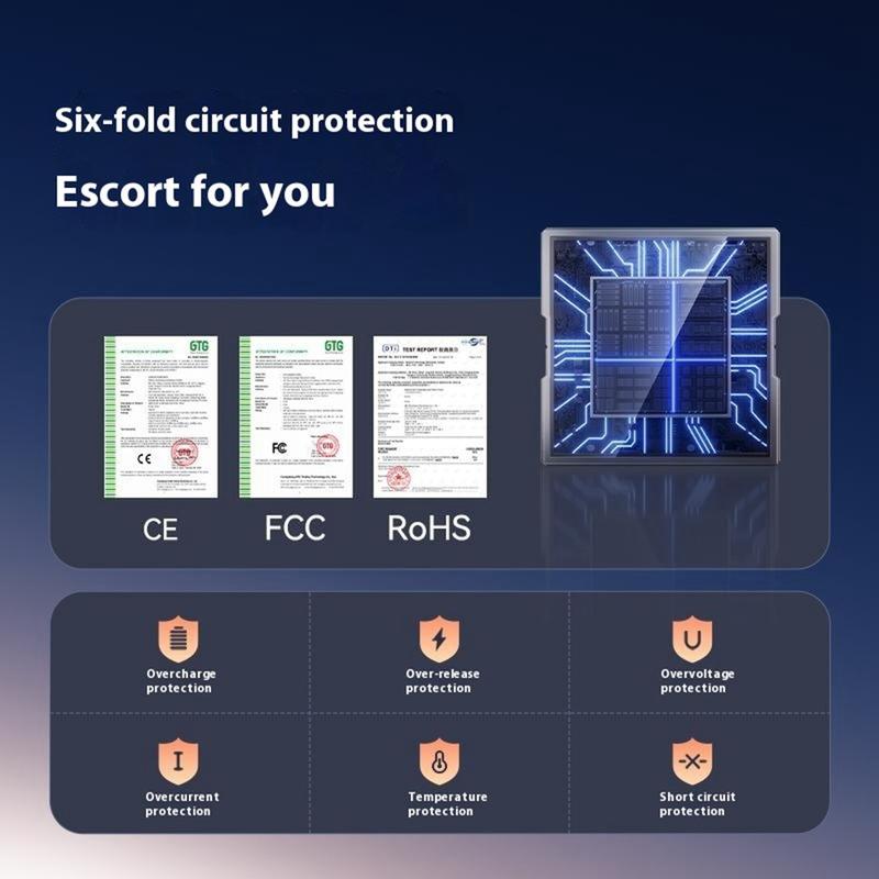 - Tripla proteção eletrónica - distribuição inteligente de energia e salvaguardas incorporadas contra falhas de sobretensão, sobrecorrente e curto-circuito.