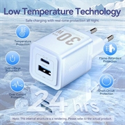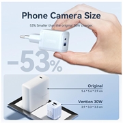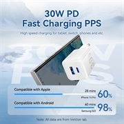 - Saída de porta dupla: USB-C (30 W PPS / PD 3.0) e USB-A (30 W QC 4.0 / QC 3.0) para telemóveis, tablets e auriculares