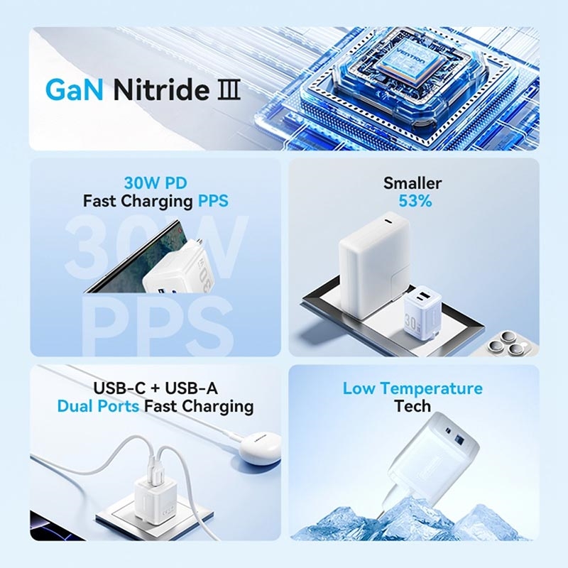 Carregue telefones, tablets e auriculares à velocidade máxima com uma ficha de bolso. O carregador VENTION FEQ GaN utiliza componentes de nitreto de gálio de última geração para fornecer 30 W completos através da porta USB-C ou USB-A, mantendo-se mais fresco e mais pequeno do que os antigos blocos de silício. O suporte multiprotocolo significa energia rápida e segura para tudo, desde telemóveis iPhone e Galaxy a Nintendo Switch e colunas Bluetooth, em casa ou na estrada.