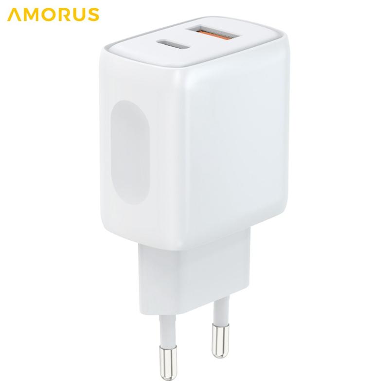 O carregador de parede AMORUS com duas portas combina uma saída USB-C PD (até 20 W) e uma saída rápida USB-A (até 18 W), permitindo carregar dois dispositivos ao mesmo tempo — ideal para smartphones, tablets, auriculares, power banks e muito mais.