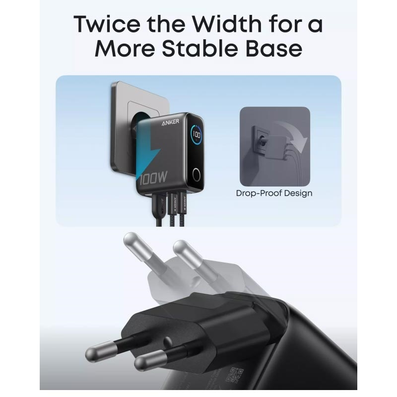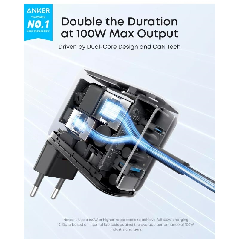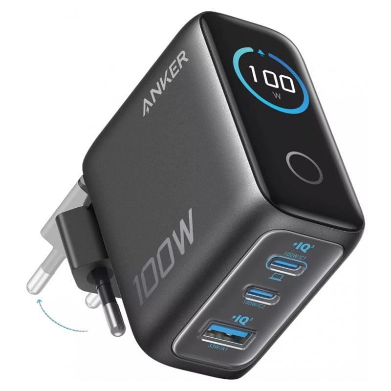 O carregador de parede Anker de 100W com GaN e ecrã inteligente é uma solução de carregamento potente e compacta, concebida para utilizadores que necessitam de um carregamento rápido e eficiente de vários dispositivos em simultâneo. Com 2 portas USB-C, 1 porta USB-A, tecnologia GaN avançada e um ecrã digital integrado, oferece uma forma mais inteligente e prática de carregar computadores portáteis, smartphones, tablets, auriculares e outros dispositivos de uso diário.