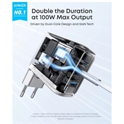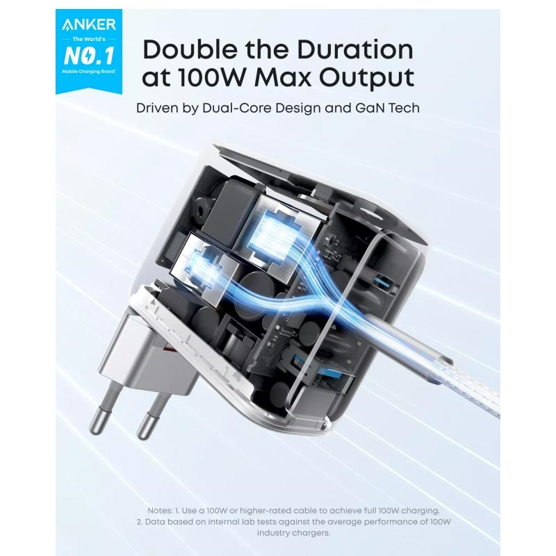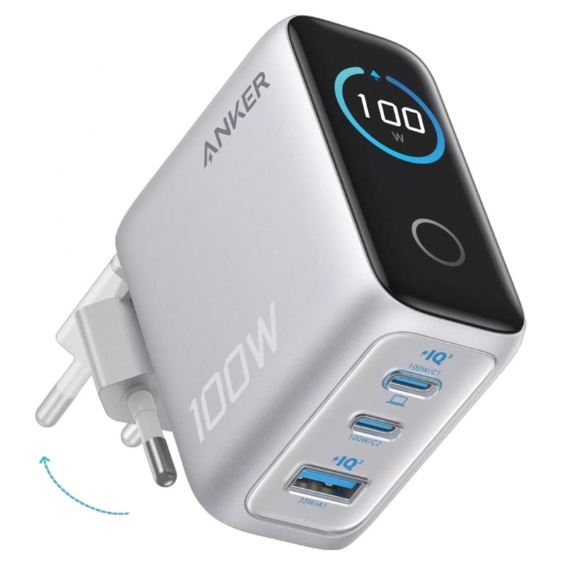O carregador de parede Anker de 100W com GaN e ecrã inteligente é uma solução de carregamento potente e compacta, concebida para utilizadores que necessitam de um carregamento rápido e eficiente de vários dispositivos em simultâneo. Com 2 portas USB-C, 1 porta USB-A, tecnologia GaN avançada e um ecrã digital integrado, oferece uma forma mais inteligente e prática de carregar computadores portáteis, smartphones, tablets, auriculares e outros dispositivos de uso diário.