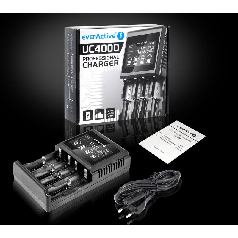 Carregador de pilhas inteligente profissional EverActive UC-4000 - 4x AAA, AA, C, D, 10440, 14500, 14650, 17500, 17670, 18350, 18500, 18650, 20700, 21700, 22650, 25500, 26500, 26650, 32650, 33600, 16340 R-CR123e