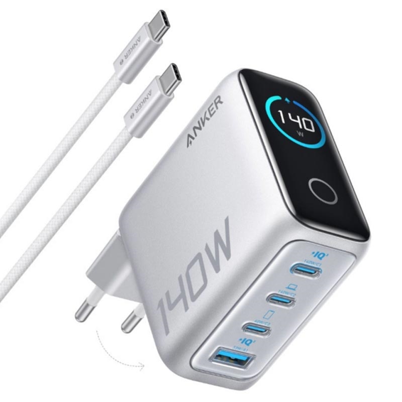 Comande a potência de classe de desktop a partir de um tijolo do tamanho da palma da mão. Construído com transístores GaN de terceira geração, o carregador Anker Zolo 140W envia até 140 watts através de três portas USB-C Power Delivery/PPS e uma porta USB-A Quick-Charge - o suficiente para reanimar um portátil de 16 polegadas, um telemóvel, um tablet e uns auriculares de uma só vez. Um ecrã sensível ao toque mostra a potência em tempo real, o estado da porta e a temperatura do carregador, enquanto os pinos dobráveis e uma base antiderrapante mantêm o adaptador estável em qualquer tomada em casa ou no estrangeiro. A proteção de oito vezes protege os dispositivos ligados contra o calor, picos de tensão e curto-circuitos, tornando-o no único carregador em que pode confiar para tudo, desde um iPhone 15 Pro Max a um drone DJI.