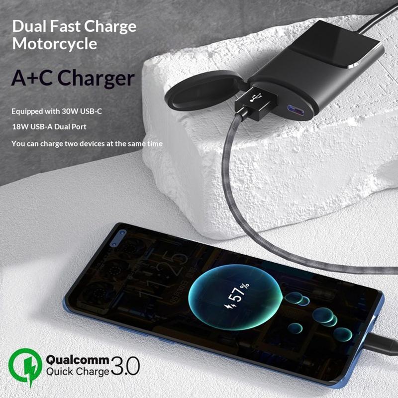 Com uma porta USB-C PD de 30W e uma porta USB-A de 18W, este carregador suporta carregamento rápido para uma vasta gama de dispositivos e permite-lhe carregar dois dispositivos ao mesmo tempo. A sua construção à prova de água IP67 e a proteção de segurança integrada tornam-no uma escolha fiável para a condução diária e para utilização ao ar livre em condições meteorológicas variáveis.