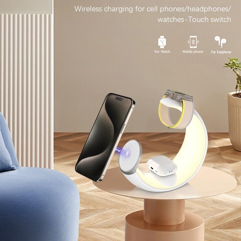 Carregador magnético sem fios 3 em 1 com luz nocturna para smartphone, smartwatch e auscultadores - 15W