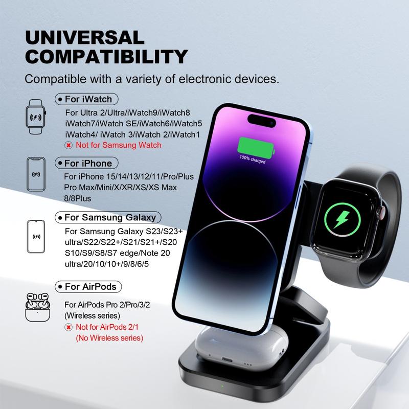 - Carregamento sem fios 3 em 1 - Suporta o carregamento simultâneo de smartphones, Apple Watch e AirPods, mantendo todos os seus dispositivos prontos a usar
