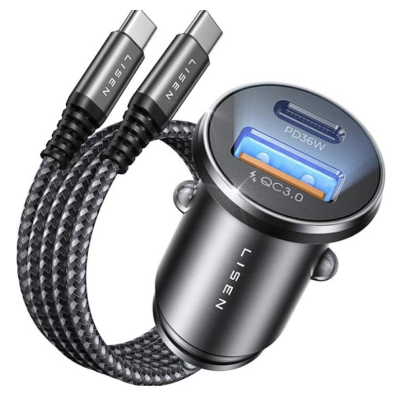 Carregador para automóvel Lisen 51W com cabo USB-C - 1 x USB-C e 1 x USB-A, Power Delivery, Quick Charge, PPS, liga de alumínio