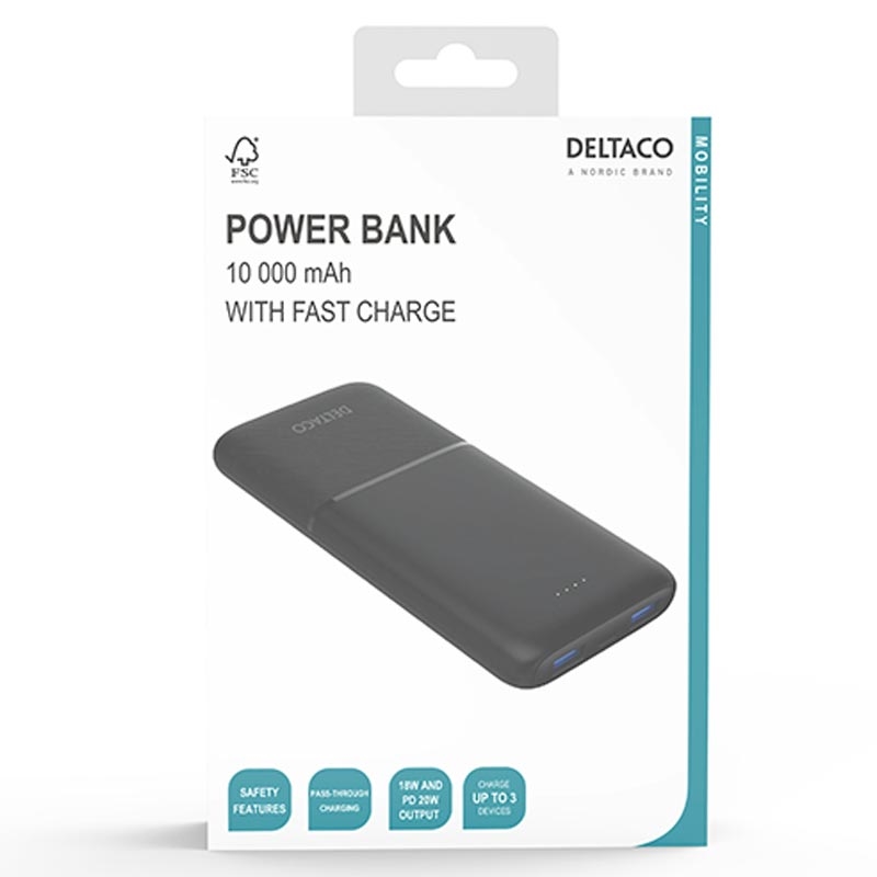Carregador portátil Deltaco de 10000mAh - Carregador portátil com USB-C PD de 20 W e duas portas USB-A de 18 W para carregamento rápido