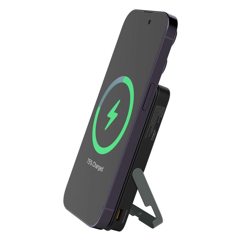 Com carregamento sem fios até 15 W para dispositivos compatíveis e até 7,5 W para iPhones, facilita o carregamento sem cabos. O íman integrado é compatível com a solução magnética da Apple e sistemas semelhantes, ajudando a manter o carregador portátil alinhado durante a utilização. O suporte integrado acrescenta flexibilidade extra, facilitando a visualização de vídeos, a navegação ou a participação em chamadas enquanto o telemóvel carrega.
