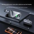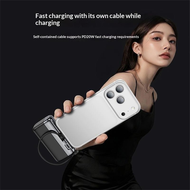 O YESIDO YP99 inclui um cabo USB-C para Lightning integrado, pelo que não precisa de andar sempre com um cabo separado consigo. O cabo integrado, em estilo cordão, possui uma ficha rotativa de 90 graus e também pode funcionar como suporte para o telemóvel, permitindo uma visualização mãos-livres mais conveniente durante o carregamento. Isto torna o carregador portátil especialmente prático para deslocações diárias, viagens ou uso diário, quando é importante reduzir ao mínimo os acessórios.