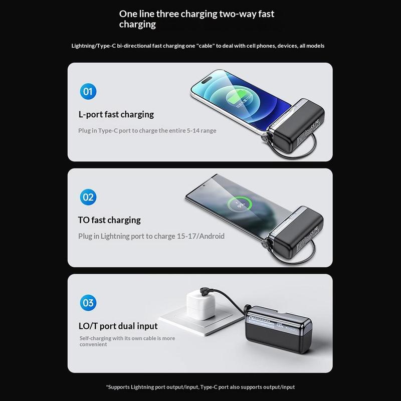 Tanto a porta USB-C como a porta USB-L suportam carregamento bidirecional, permitindo que o próprio carregador portátil se recarregue rapidamente, ao mesmo tempo que oferece opções flexíveis de carregamento de dispositivos. Pode suportar o carregamento de mais do que um dispositivo, dependendo das suas necessidades de utilização, tornando-o útil para pessoas que transportam vários dispositivos ao longo do dia. Esta flexibilidade adicional ajuda a torná-lo um acessório de carregamento portátil mais versátil.