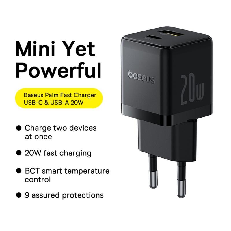 Transforme a sua rotina de carregamento com o Carregador Rápido BASEUS Palm Dual-Port 20W e experimente um fornecimento de energia rápido e seguro para todos os seus dispositivos.