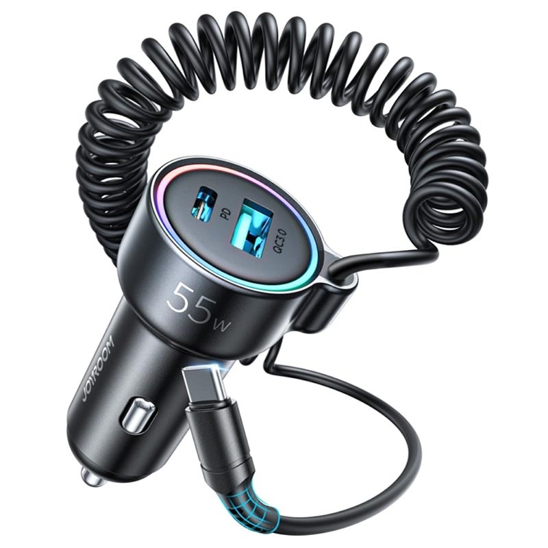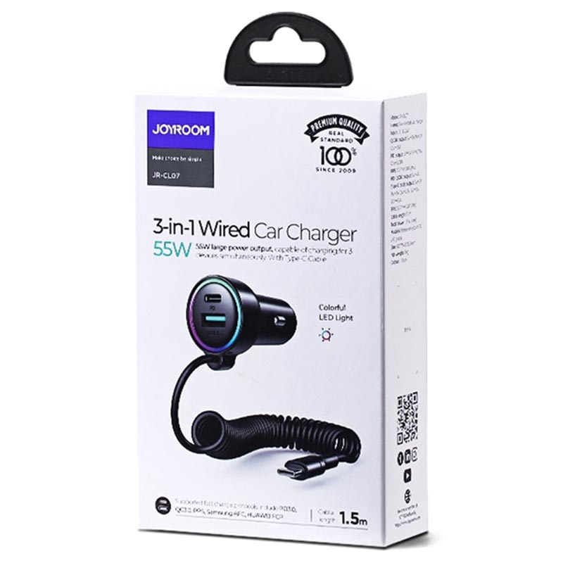 Carregador Rápido de Carro 3 em 1 com Fios Joyroom JR-CL07 55W - 1xUSB, 1xUSB-C, QC3.0, PD, PPS, AFC, FCP