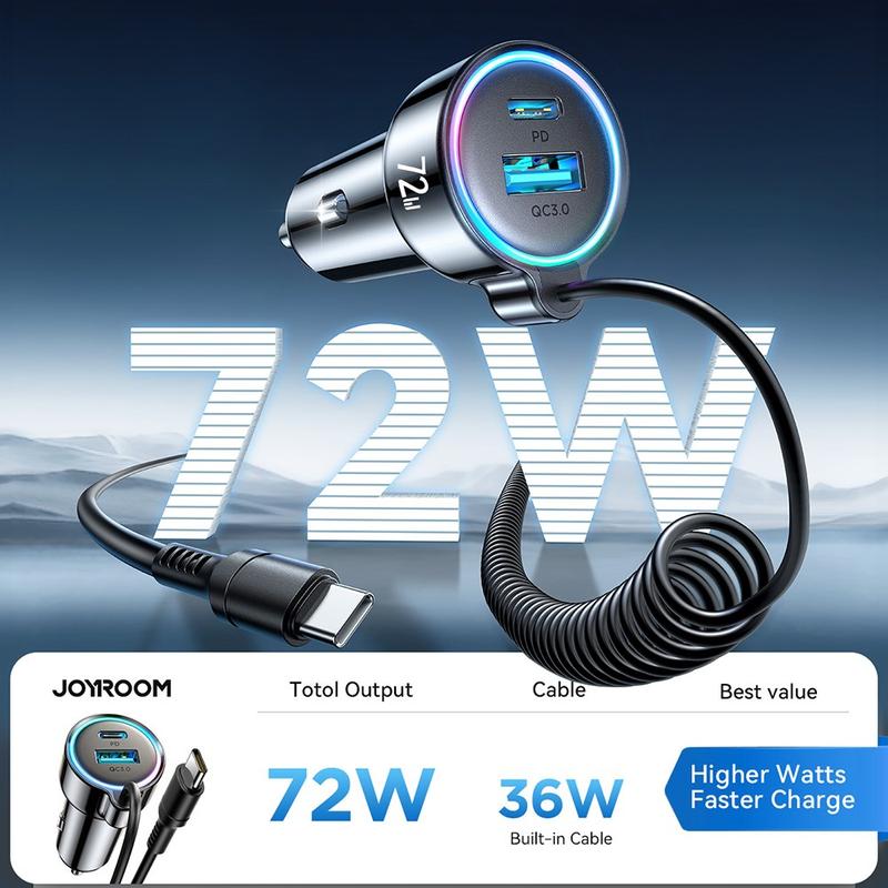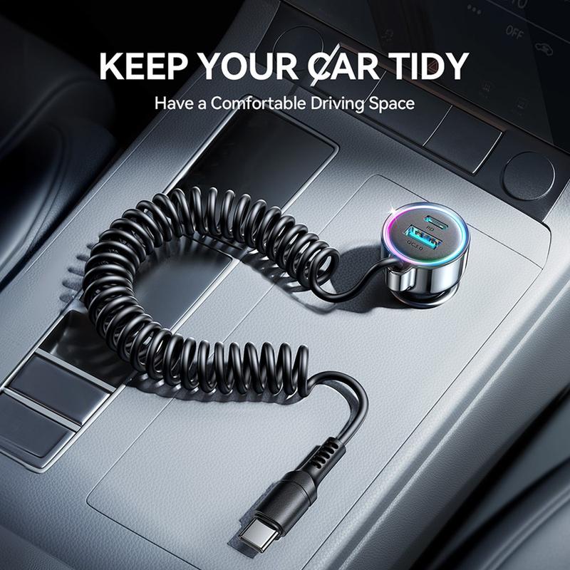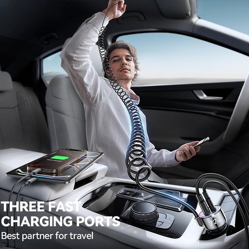 Joyroom CL07 72W Carregador de automóvel rápido 3 em 1 com cabo de mola tipo C de 1,6 m e portas USB-C/USB-A