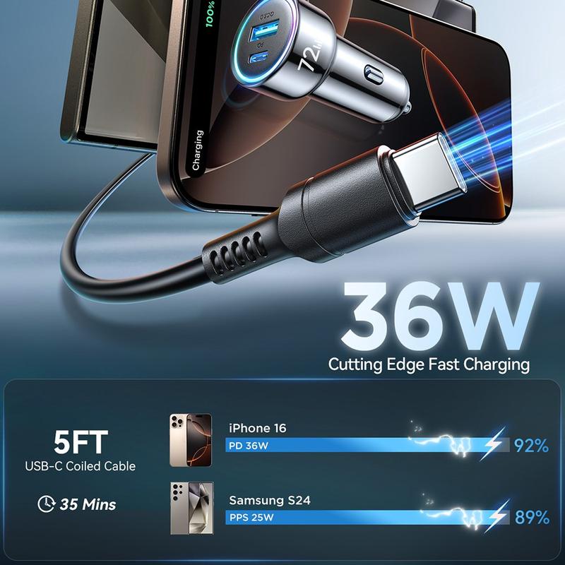 Mantenha todos os passageiros carregados durante as longas deslocações ou viagens de férias. O Joyroom CL07 fornece uma potência combinada de 72W, emparelhando uma porta USB-C PD/PPS, uma porta USB-A QC 3.0 e um cabo em espiral USB-C extensível de 1,6 m incorporado. Um anel colorido de 7 LEDs torna as portas fáceis de detetar à noite, enquanto a proteção de segurança de seis vezes e a caixa de PC retardador de chamas (grau V-0) garantem tranquilidade para si e para o seu veículo.